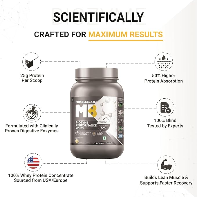 MuscleBlaze Biozyme Performance Whey Protein Powder (French Vanilla Creme, 1kg / 2.2lbs) | Clinically Tested 50% Higher Protein Absorption