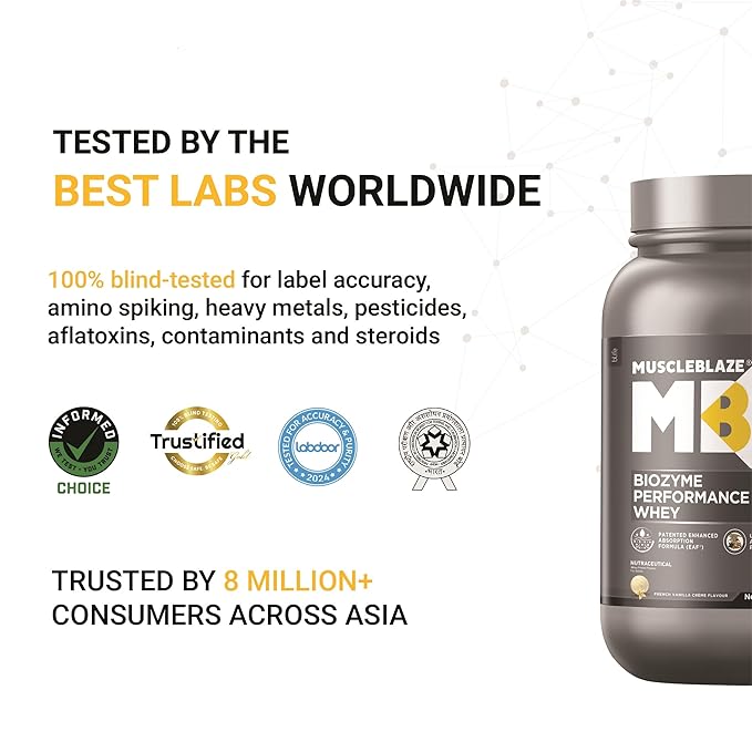 - INFORMED CHOICE, UK, LABDOOR, USA & TRUSTIFIED- TESTED & CERTIFIED: MuscleBlaze Biozyme Whey Protein has been regularly & rigorously tested, certified by Informed Choice Program U.K., Labdoor USA, Trustified for Accuracy of label Claims (Protein content, no amino spiking) & Purity (free from heavy metals or biological contaminants)